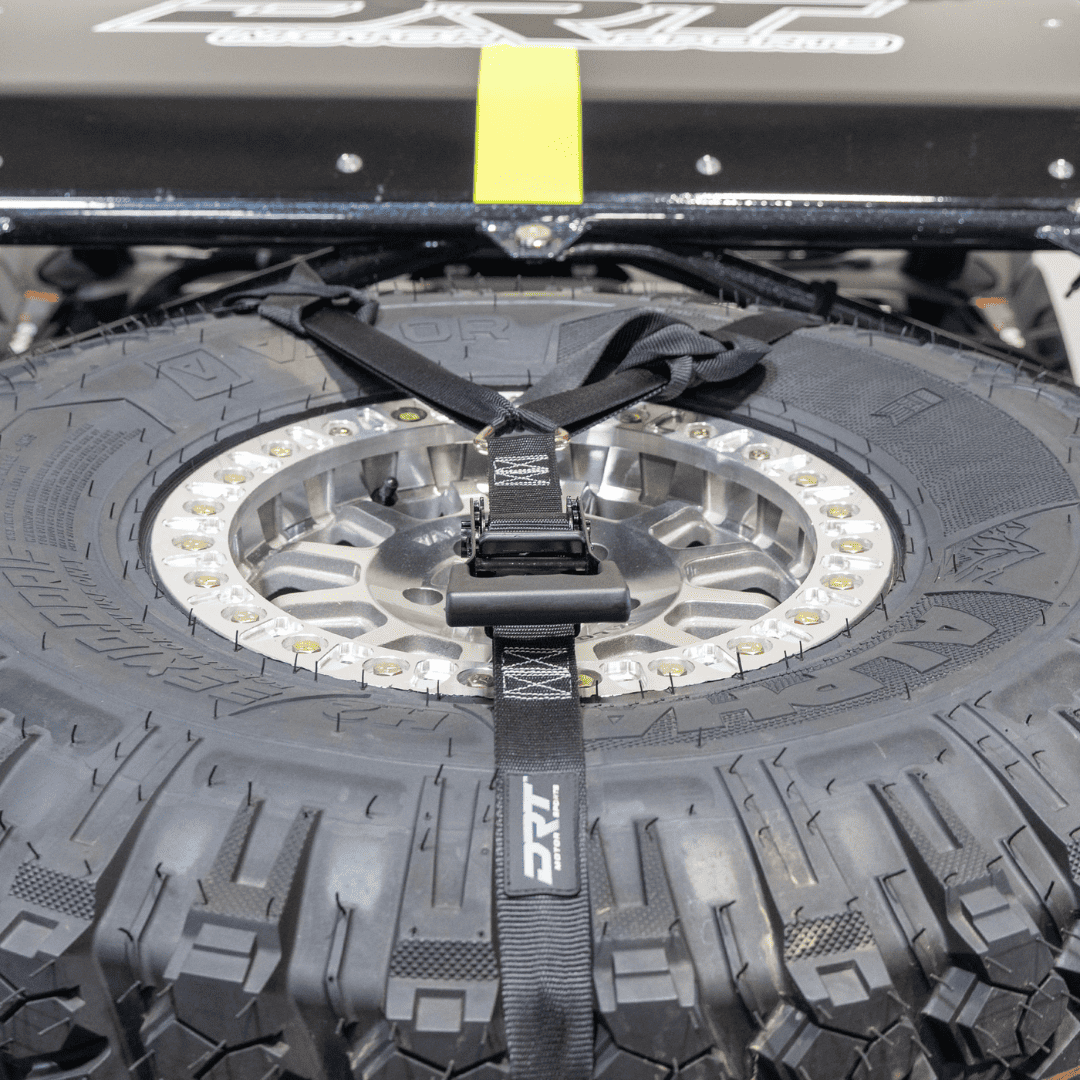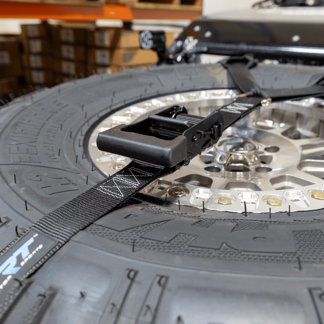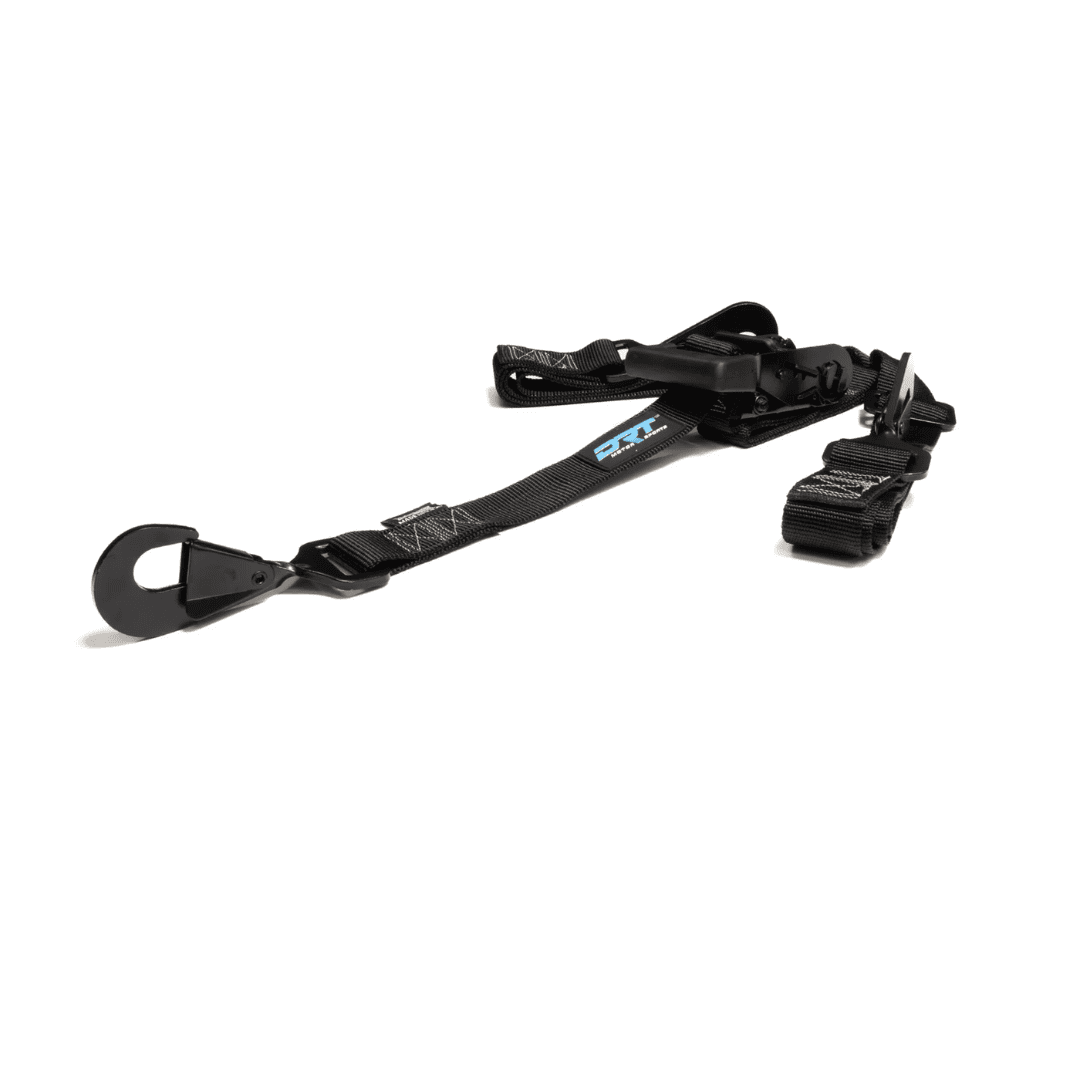 La correa en Y con trinquete DRT Motorsports (3 puntos) (UPC 10005TC01401) está fabricada en los EE. Todos los componentes de acero están enchapados en zinc para una larga vida útil y uso en las condiciones más duras. Ajustable para una amplia gama de neumáticos. Los ganchos de acero plastificado protegen las superficies y los puntos de contacto de los acabados dañinos.